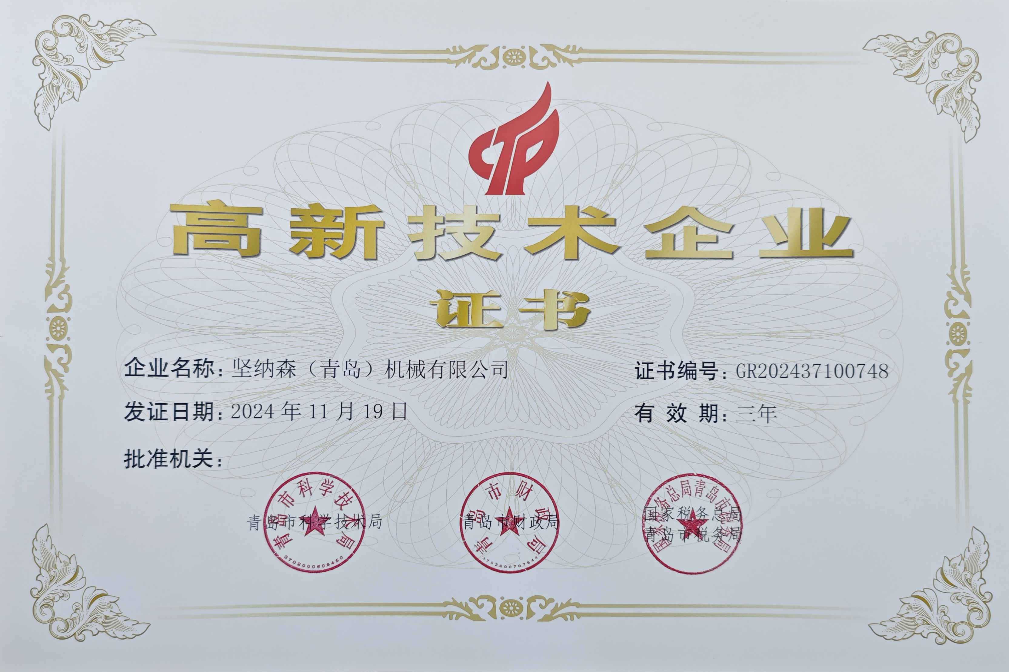 • 熱烈祝賀堅納森(青島)機械有限公司榮獲“高新技術企業(yè)”再次認定!
